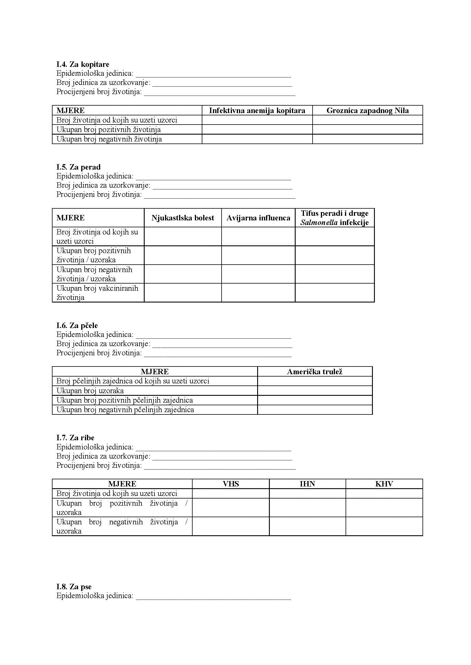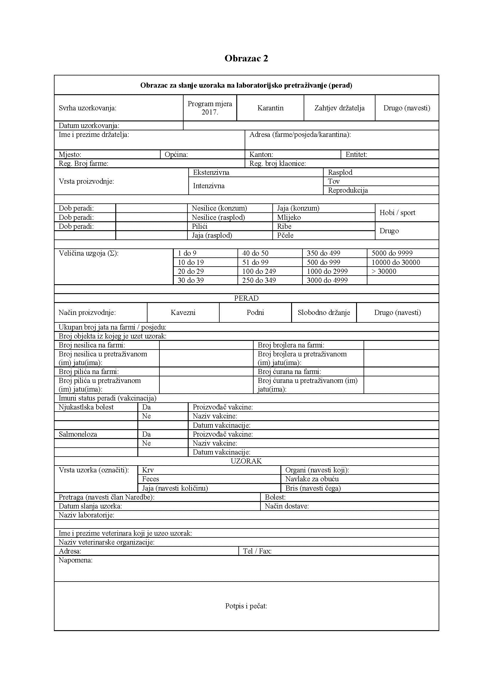 (4) Laboratorijski dijagnostički postupci predviđeni ovom Naredbom provode se u ovlaštenim veterinarskim laboratorijama i/ili u slučaju potrebe u Evropskoj uniji (u daljnjem tekstu: EU), odnosno priznatim laboratorijama Svjetske organizacije za zdravlje životinja (OIE). Prilikom slanja uzoraka u ovlaštenu dijagnostičku laboratoriju, veterinarska organizacija dužna je koristiti Obrazac za slanje uzoraka na laboratorijsko ispitivanje iz Priloga III ovog Programa. Zaseban obrazac se dostavlja za svako imanje (vlasnika životinja) ili farmu. Ovlaštene veterinarske dijagnostičke laboratorije mogu zaprimati samo uzorke praćene Obrascem iz Priloga III. ovog Programa i dužne su izdati zaseban nalaz laboratorijskog ispitivanja sa svaki dostavljeni Obrazac, odnosno za svako zasebno imanje ili farmu.