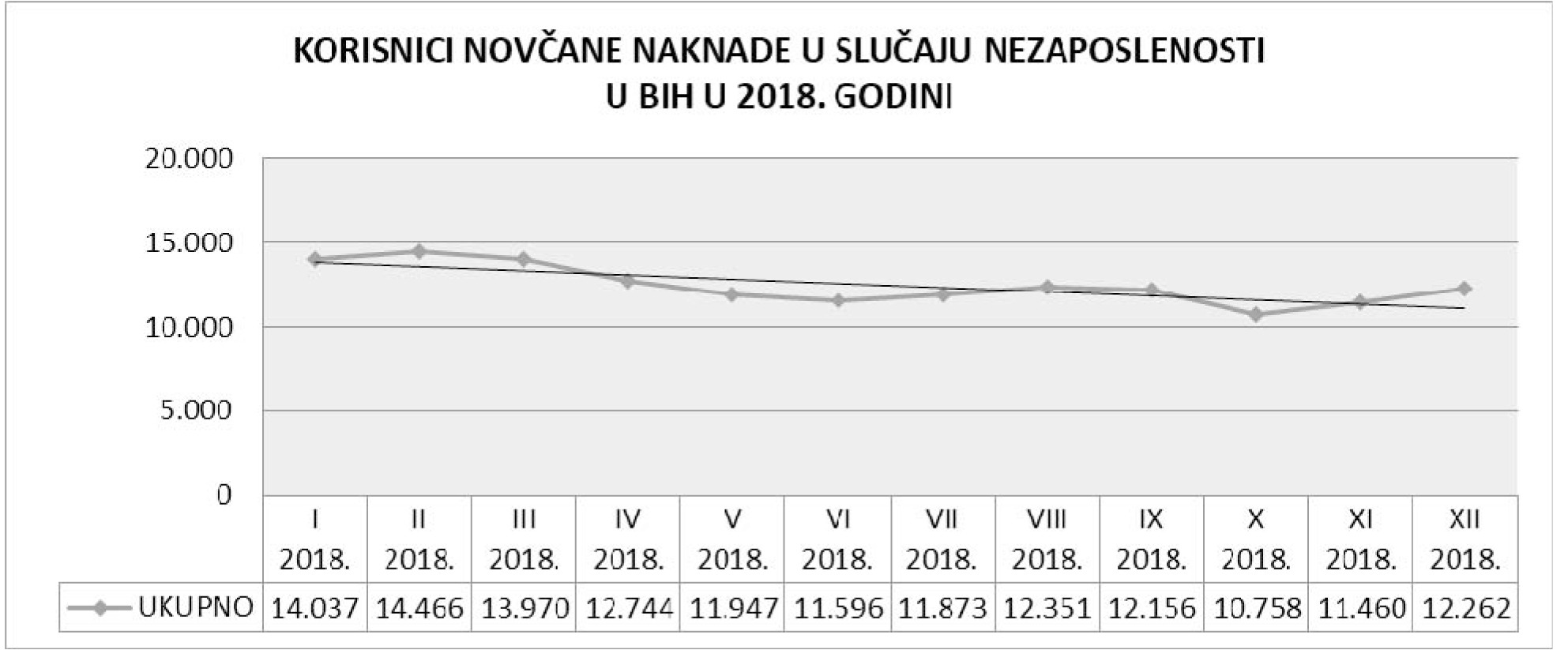 Broj korisnika prava po osnovu nezaposlenosti takođe je smanjen u odnosu na 2017. godinu. U 2018. godini prosječan broj korisnika novčane naknade bio je 12.468 ili 2,8% od ukupnog broja registrovanih nezaposlenih osoba. Ovaj broj se u odnosu na 2017. godinu, smanjio za 8,4%. Pravo na zdravstvenu zaštitu po osnovu nezaposlenosti u decembru 2018. godine ostvarilo je 374.264 osoba ili 85,9% od ukupno registrovane nezaposlenosti u Bosni i Hercegovini.
