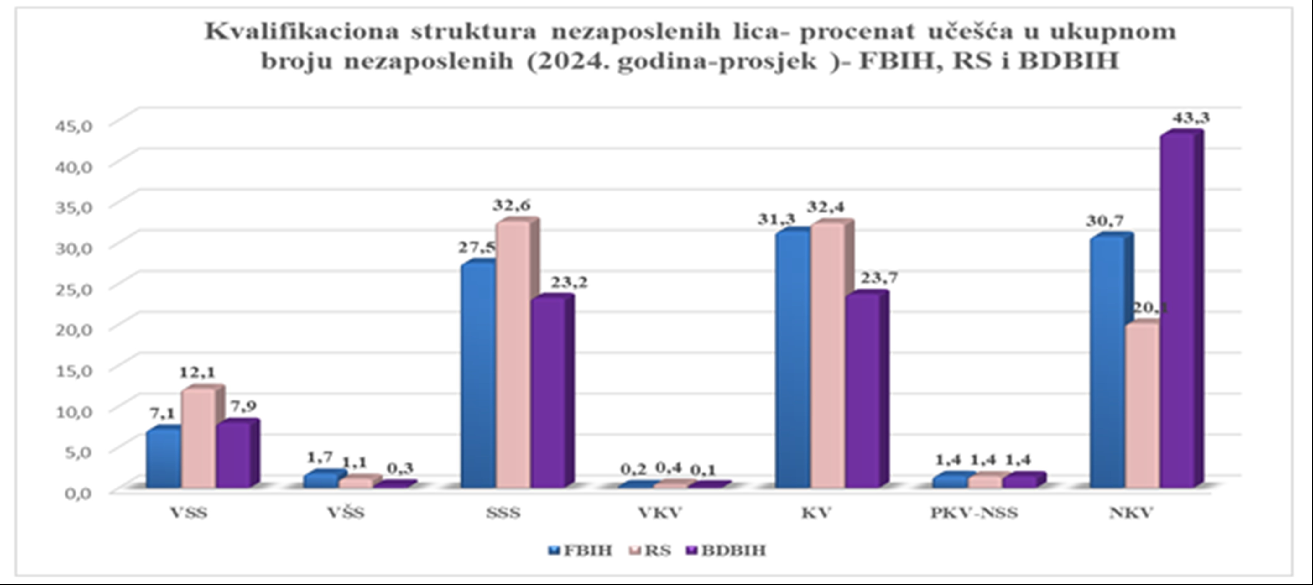 Što se tiče kvalifikacione strukture, najveće učešće u ukupnoj nezaposlenosti u 2024. godini u Bosni i Hercegovini činile su osobe sa trećim stepenom obrazovanja odnosno KV radnici 31,2%, zatim NKV radnici 29,4%, te radnici sa SSS 28,2%. Prema kvalifikacionoj strukturi nezaposlenih žena stanje je nešto drugačije i najviše je nezaposlenih žena sa srednjom stručnom spremom 31,5%, 29,8% je NKV radnica, a 25,9 % čine KV radnice. Posmatrano po entitetima, što se tiče kvalifikacione strukture u Federaciji BiH najviše je nezaposlenih KV radnika, zatim NKV radnika, a onda slijede radnici sa SSS, u Republici Srpskoj najviše nezaposlenih čine radnici sa SSS, zatim KV radnici, te NKV radnici, dok je u Brčko distriktu BiH nešto drugačiji odnos i najviše je nezaposlenih NKV radnika, zatim slijede KV radnici, te radnici sa SSS.