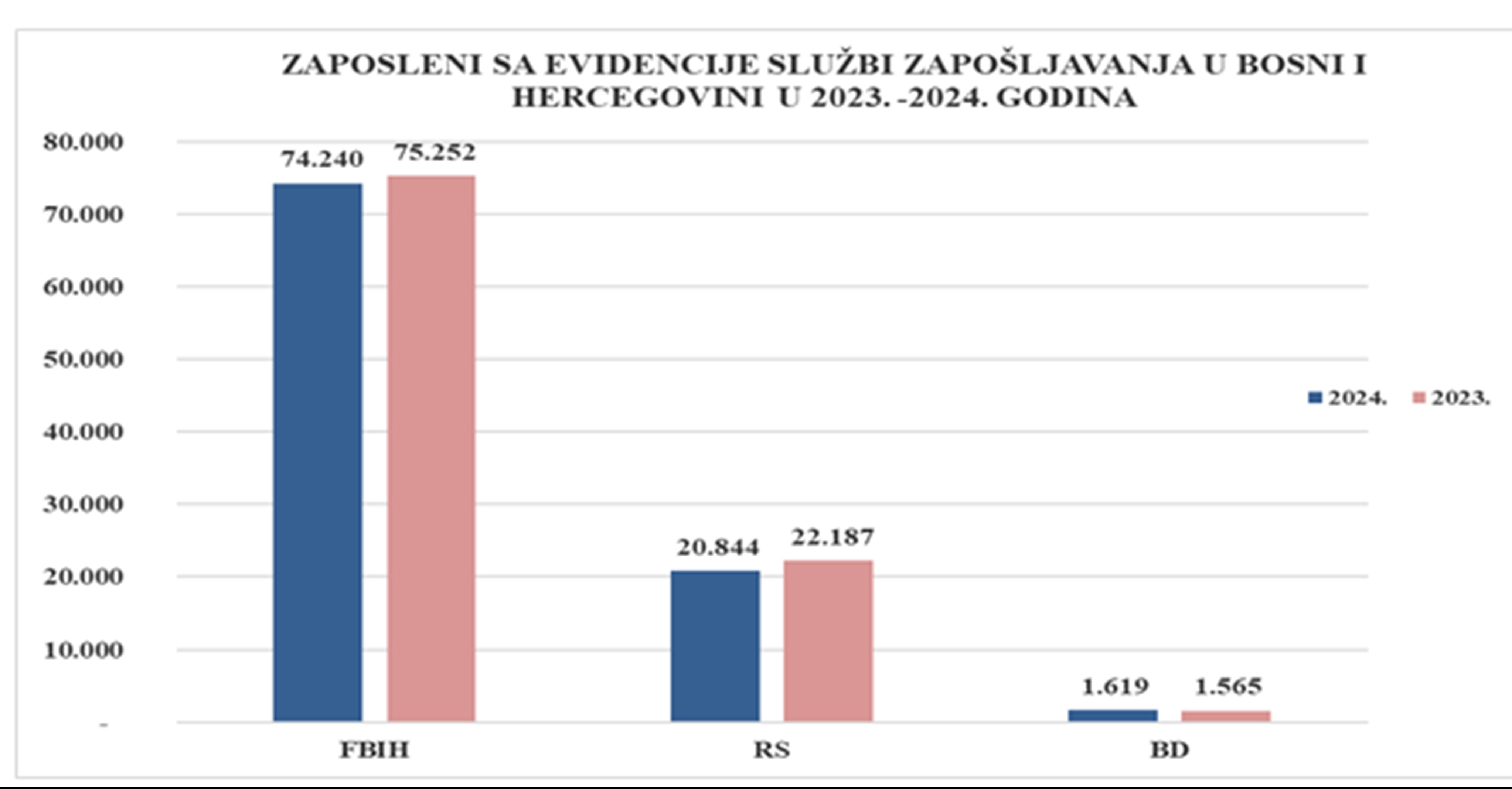 U 2024. godini zabilježen je pad broja nezaposlenih lica na evidencijama zavoda i službi zapošljavanja u Bosni i Hercegovini.