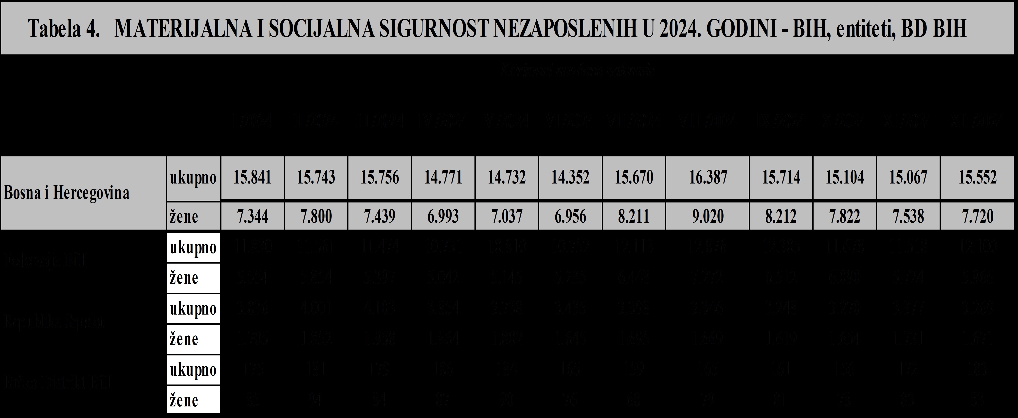 Broj korisnika prava po osnovu nezaposlenosti povećan je u odnosu na 2023. godinu. U 2024. godini prosječan broj korisnika novčane naknade u Bosni i Hercegovini bio je 15.391 ili 4,7% od ukupnog broja registrovanih nezaposlenih lica, od čega 7.674 žene. Ovaj broj se u odnosu na 2023. godinu, povećao za 5,1%. U Federaciji BiH broj korisnika novčane naknade povećan je za 6,1%, u Republici Srpskoj za 1,3%, a u Brčko distriktu BiH za 23,3% u odnosu na 2023. godinu.