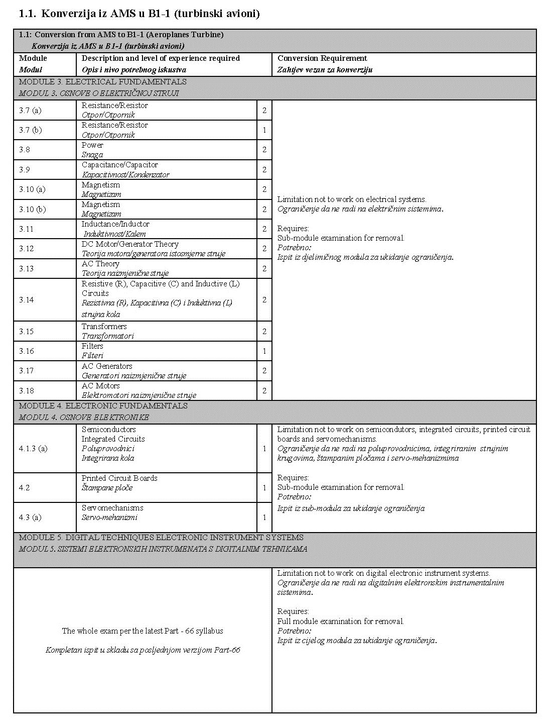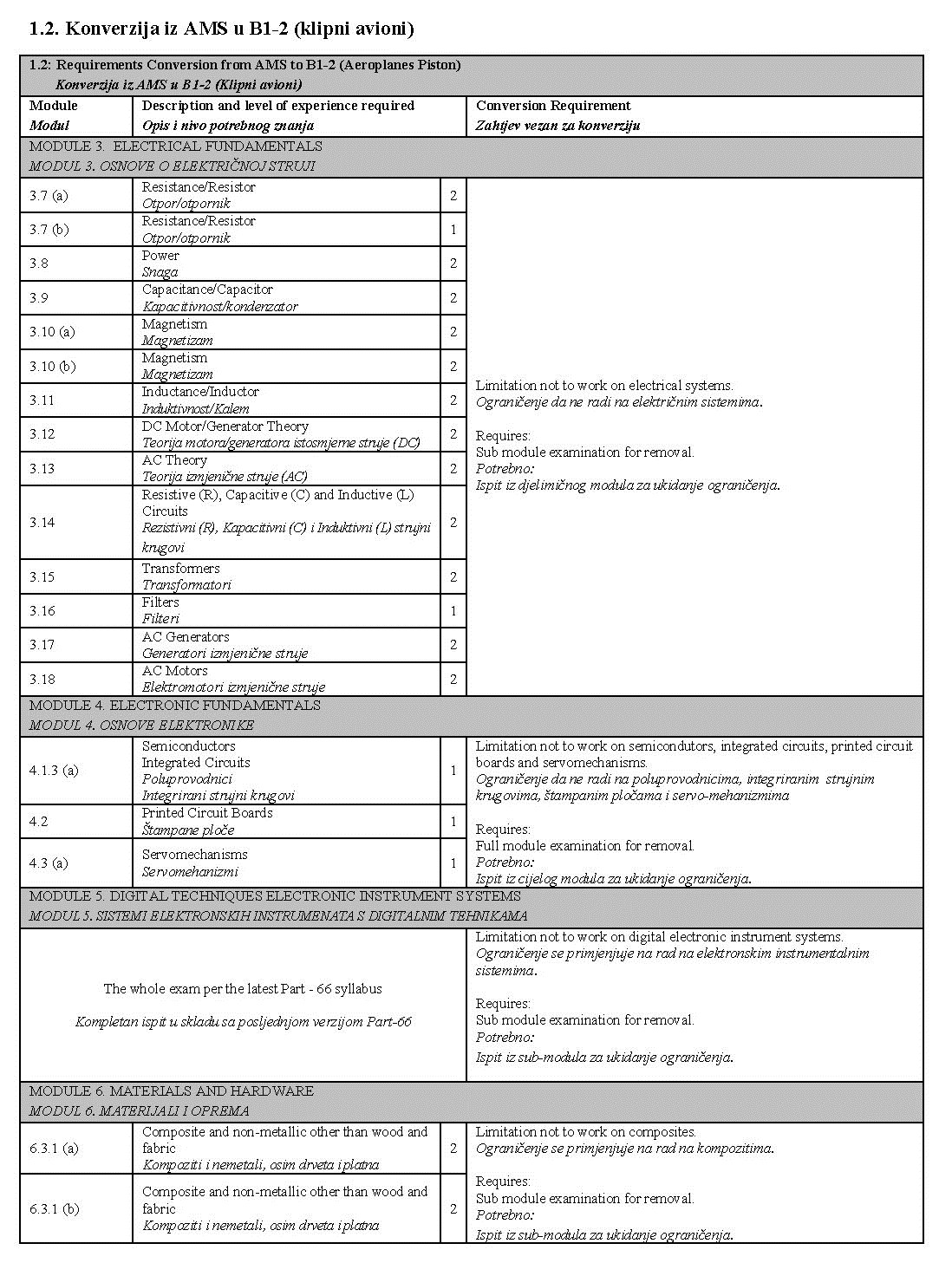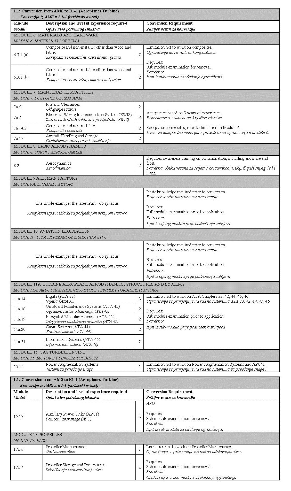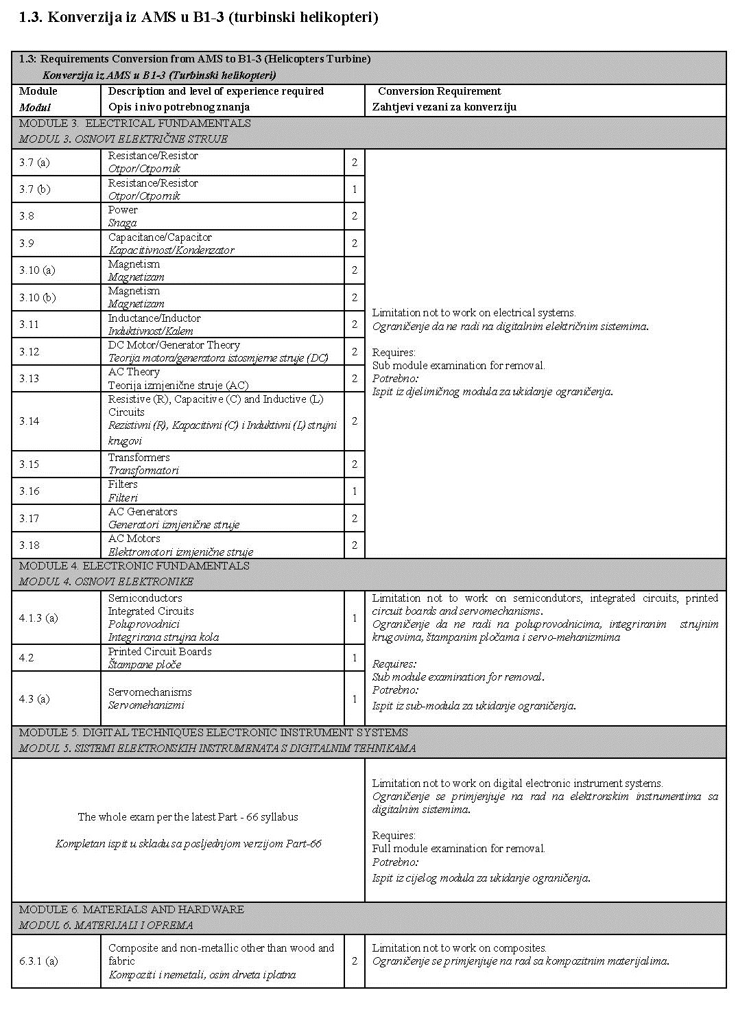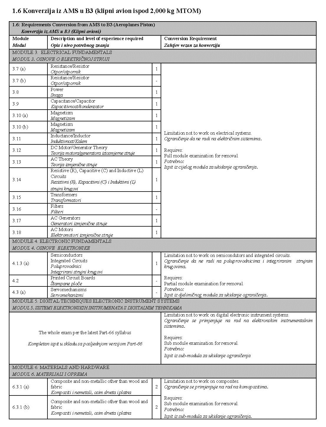 U narednim tabelama prikazane su detaljne razlike između prethodnih planova i programa i tema iz Part-66 modula, kao i moguća ograničenja koja se unose u dozvolu prilikom konverzije: