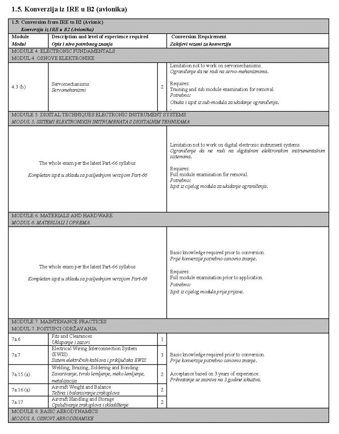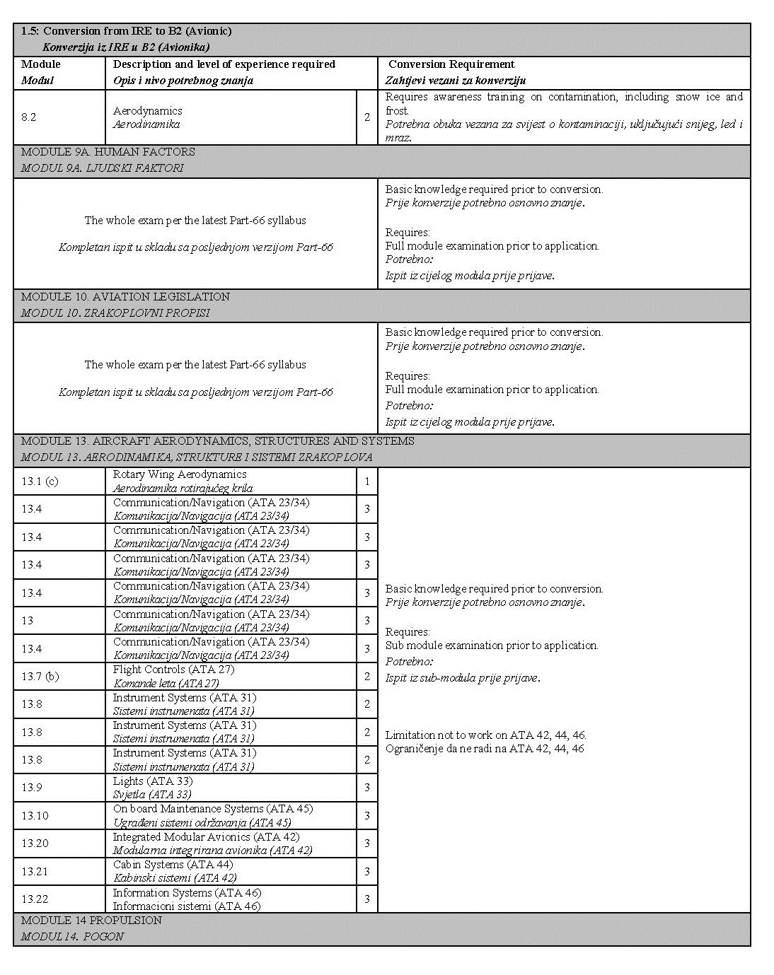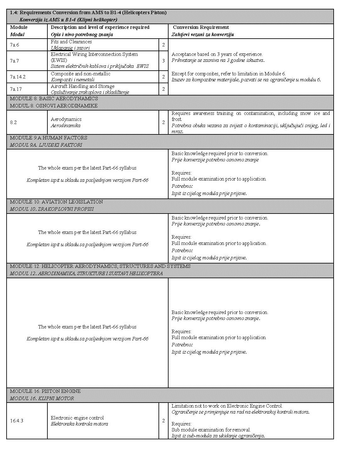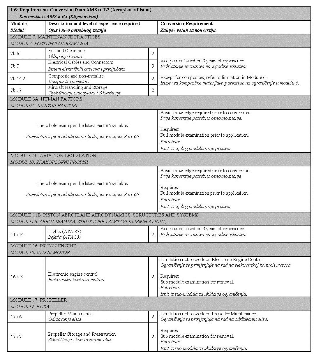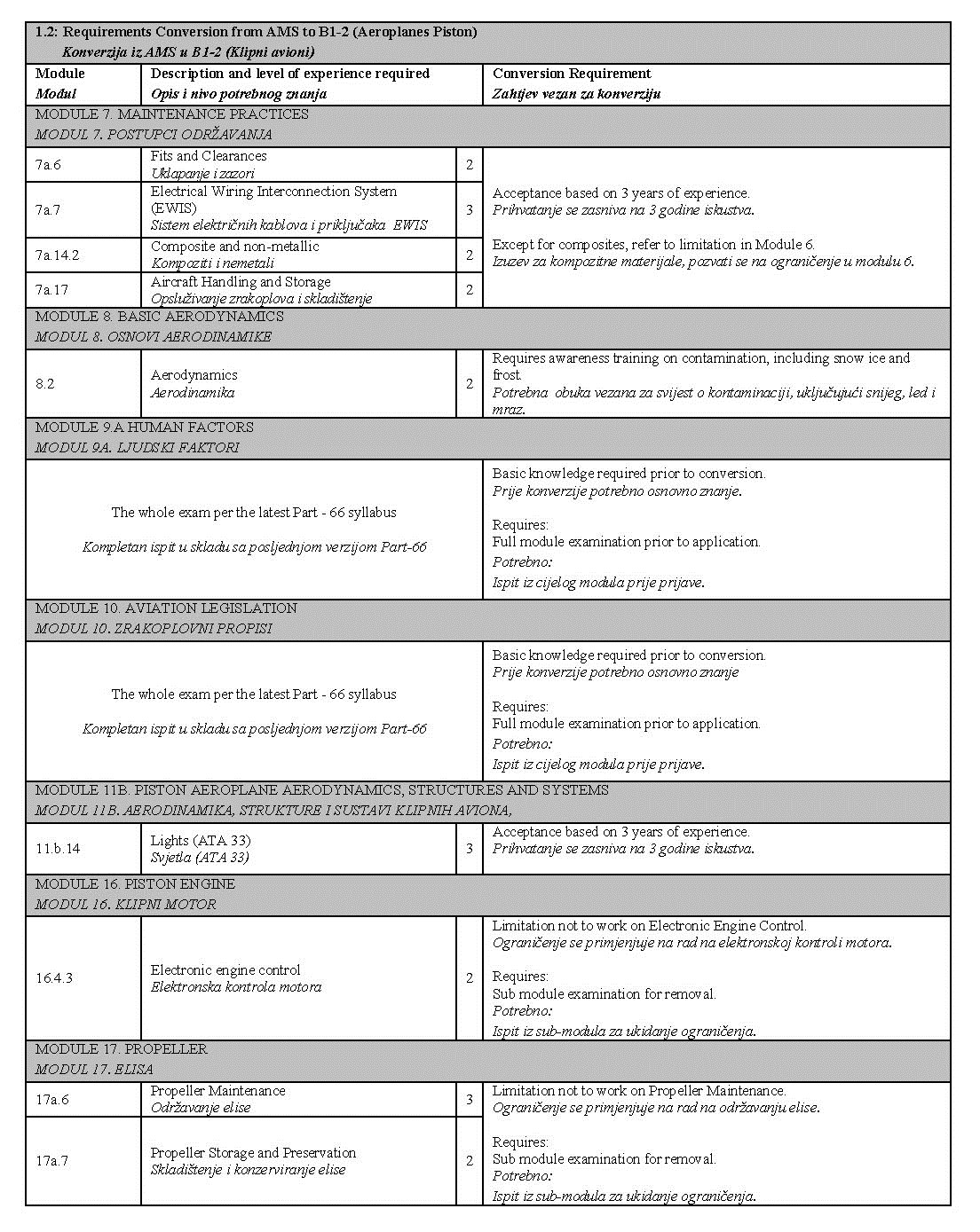 U narednim tabelama prikazane su detaljne razlike između prethodnih planova i programa i tema iz Part-66 modula, kao i moguća ograničenja koja se unose u dozvolu prilikom konverzije: