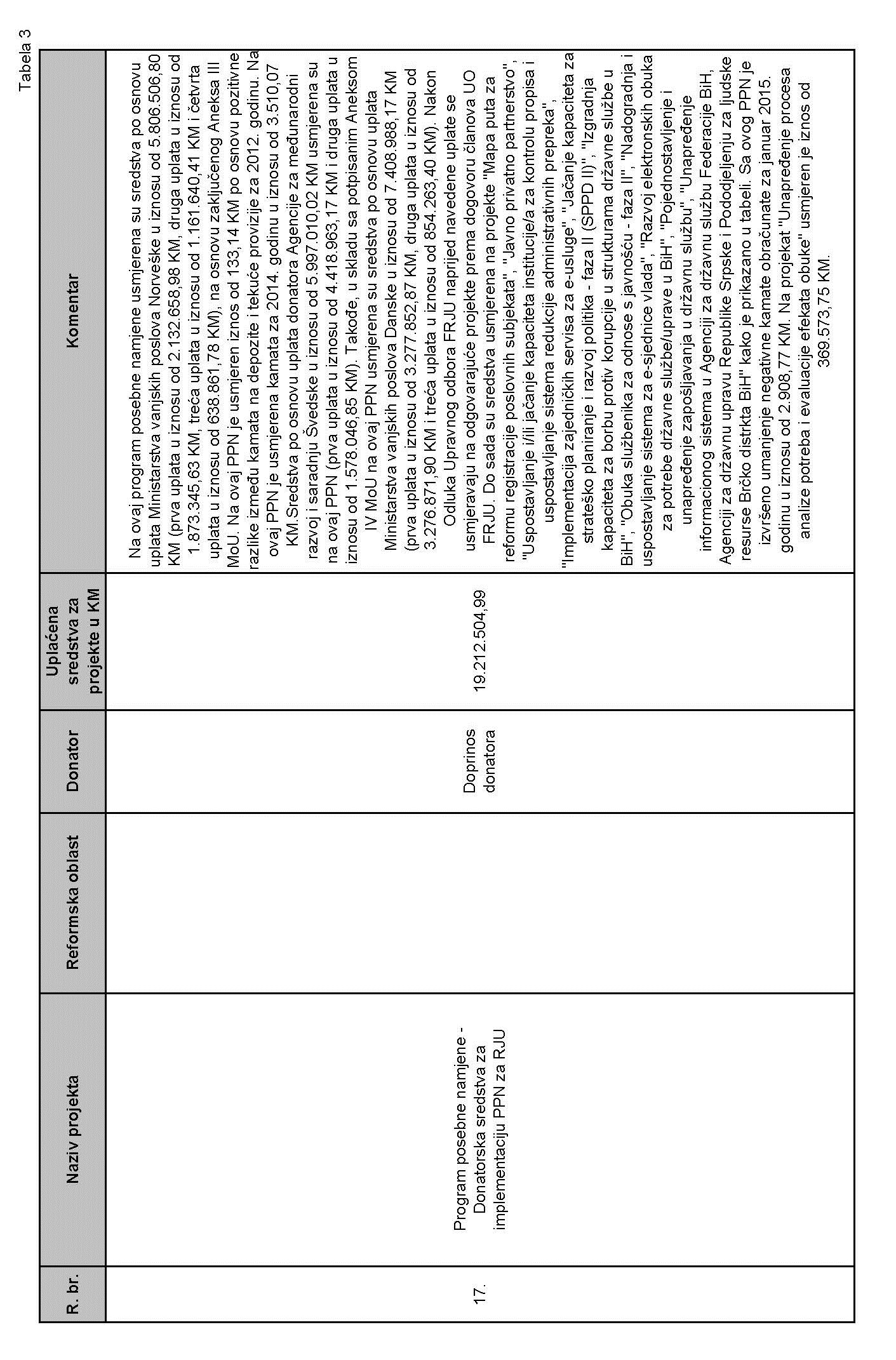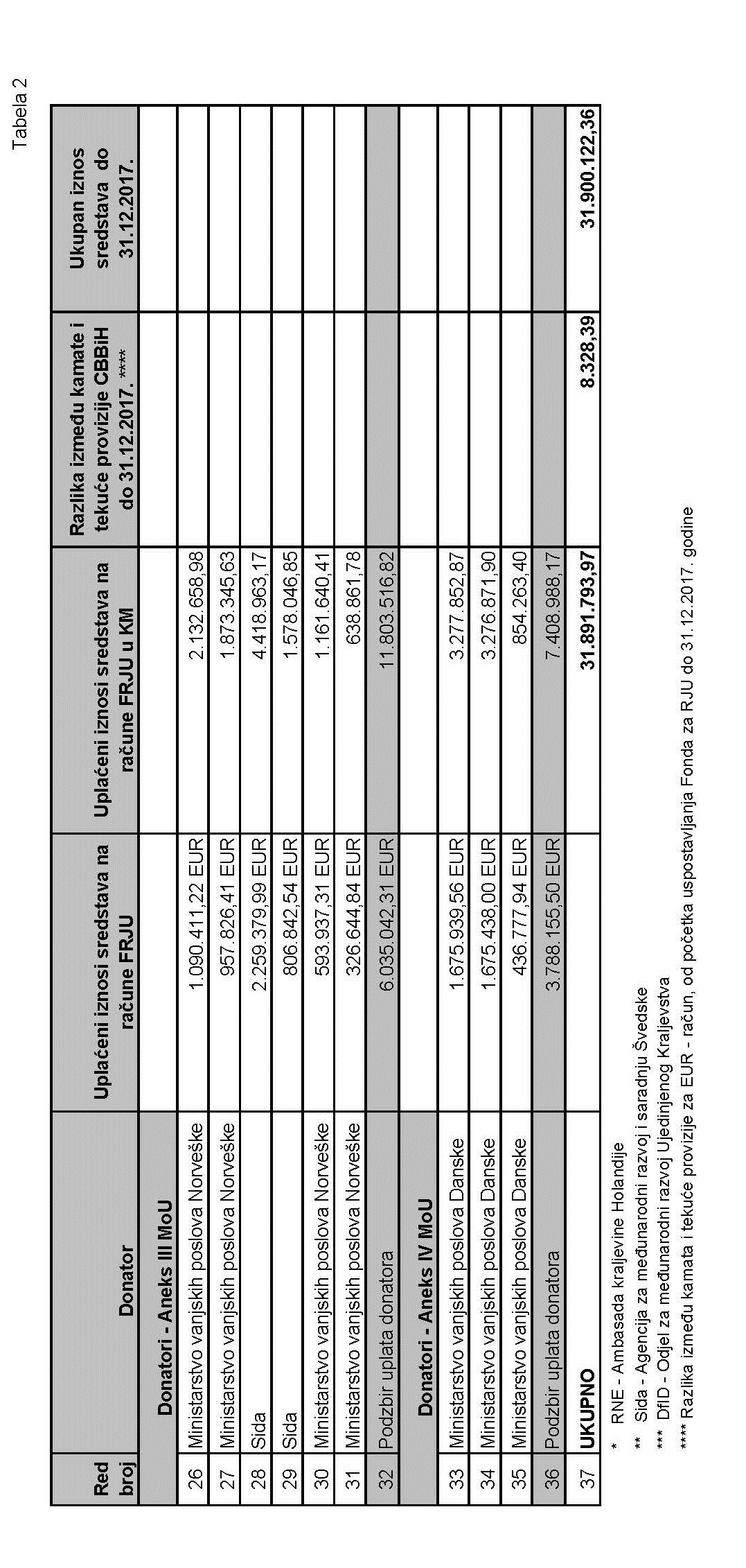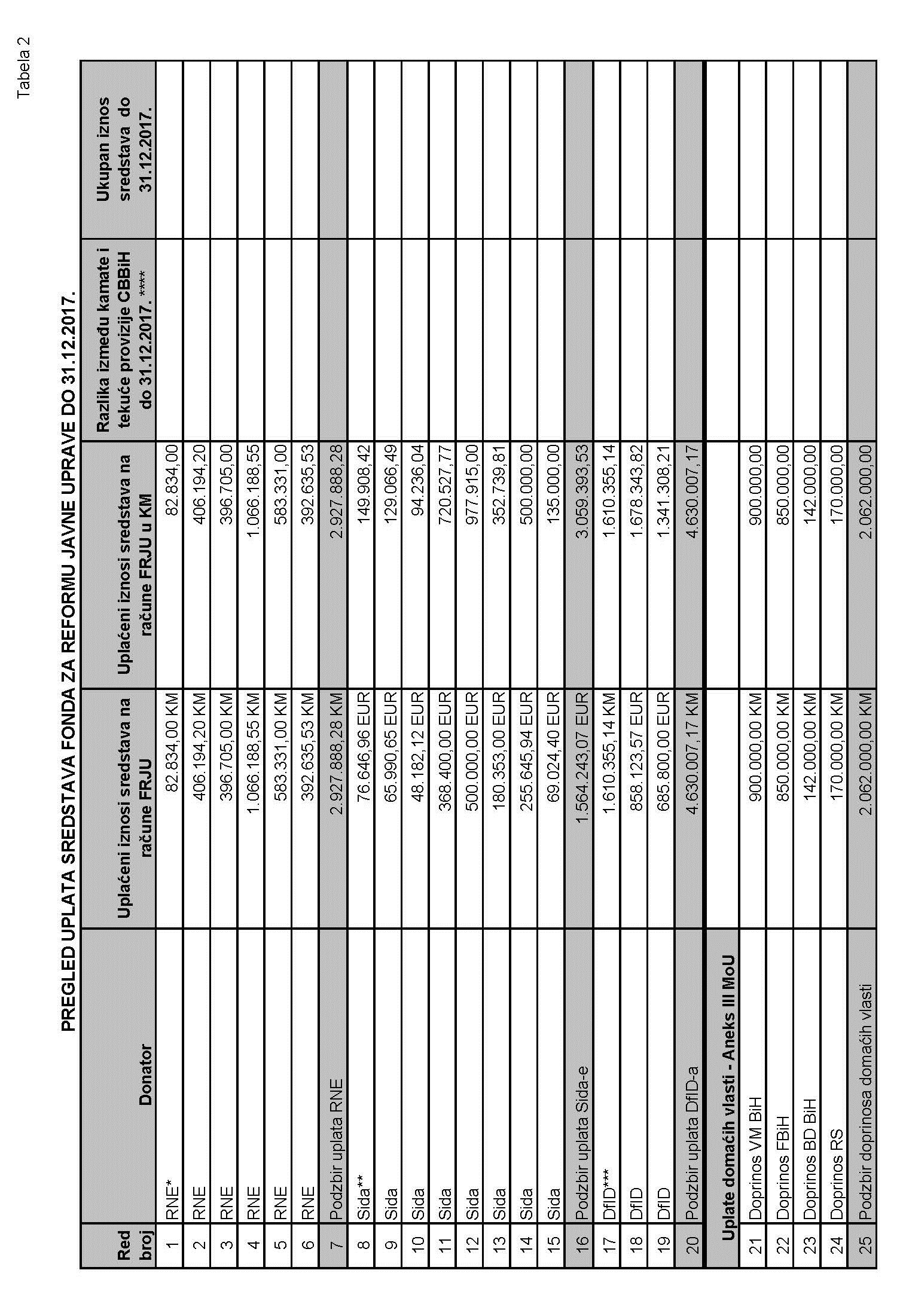 2. Pregled uplata sredstava Fonda za reformu javne uprave do 31.12.2017. godine (Tabela 2);