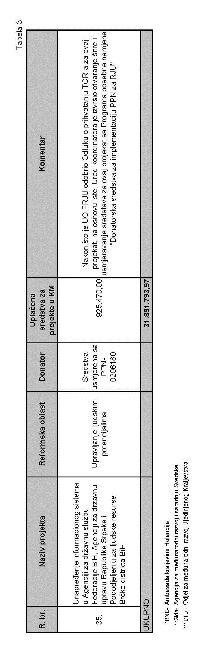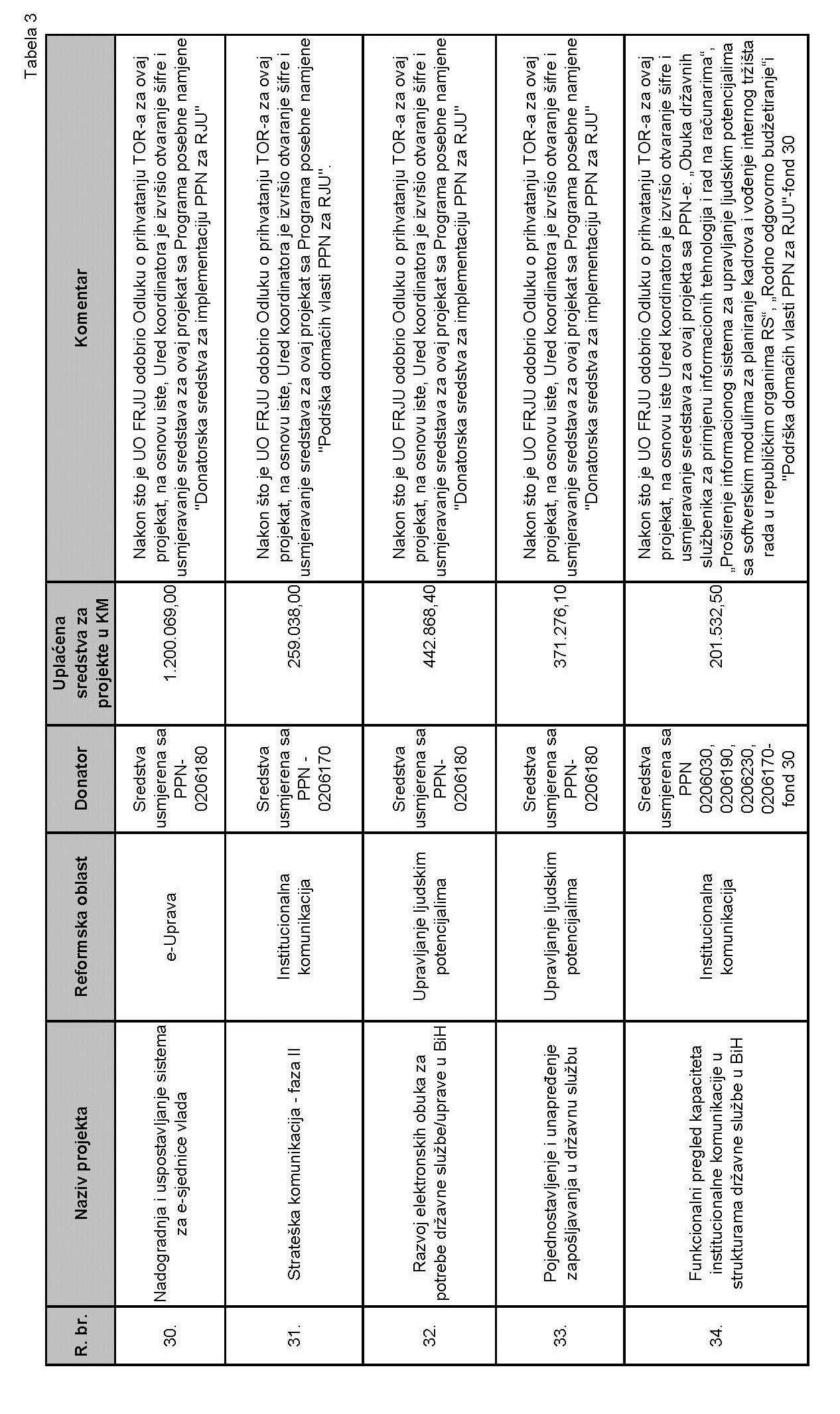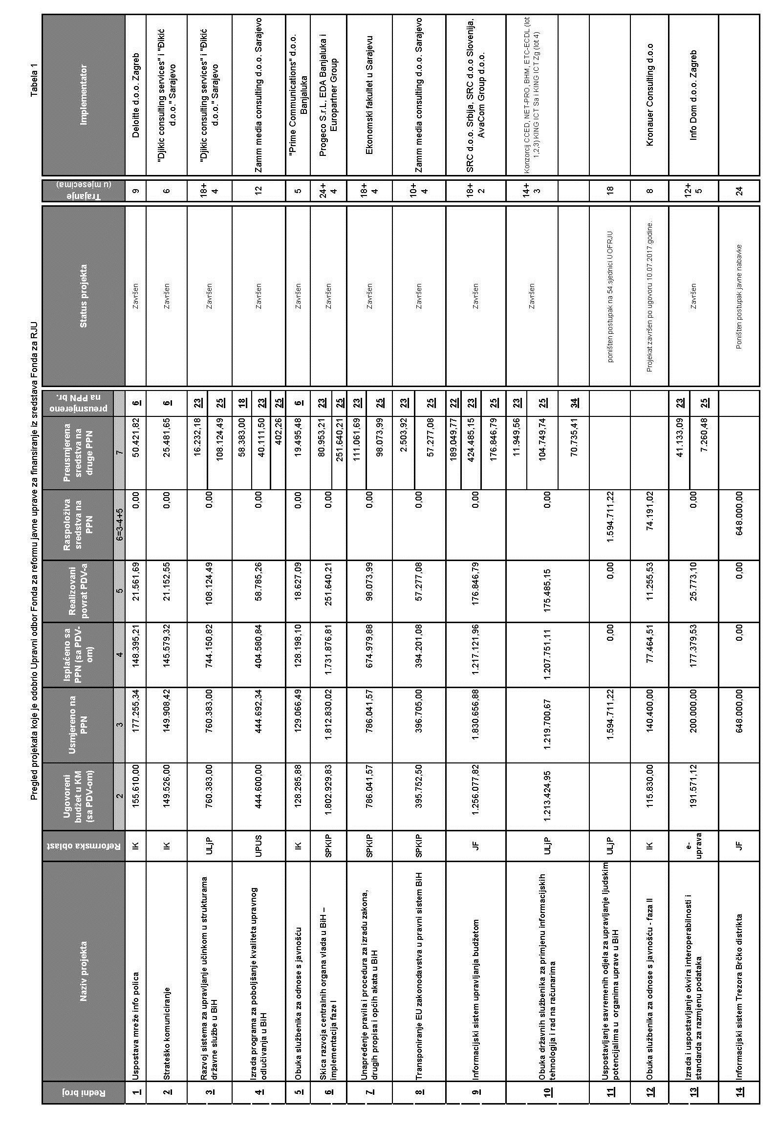 1. Pregled projekata koje je odobrio Upravni odbor Fonda za reformu javne uprave za finansiranje iz sredstava Fonda za reformu javne uprave (Tabela 1);