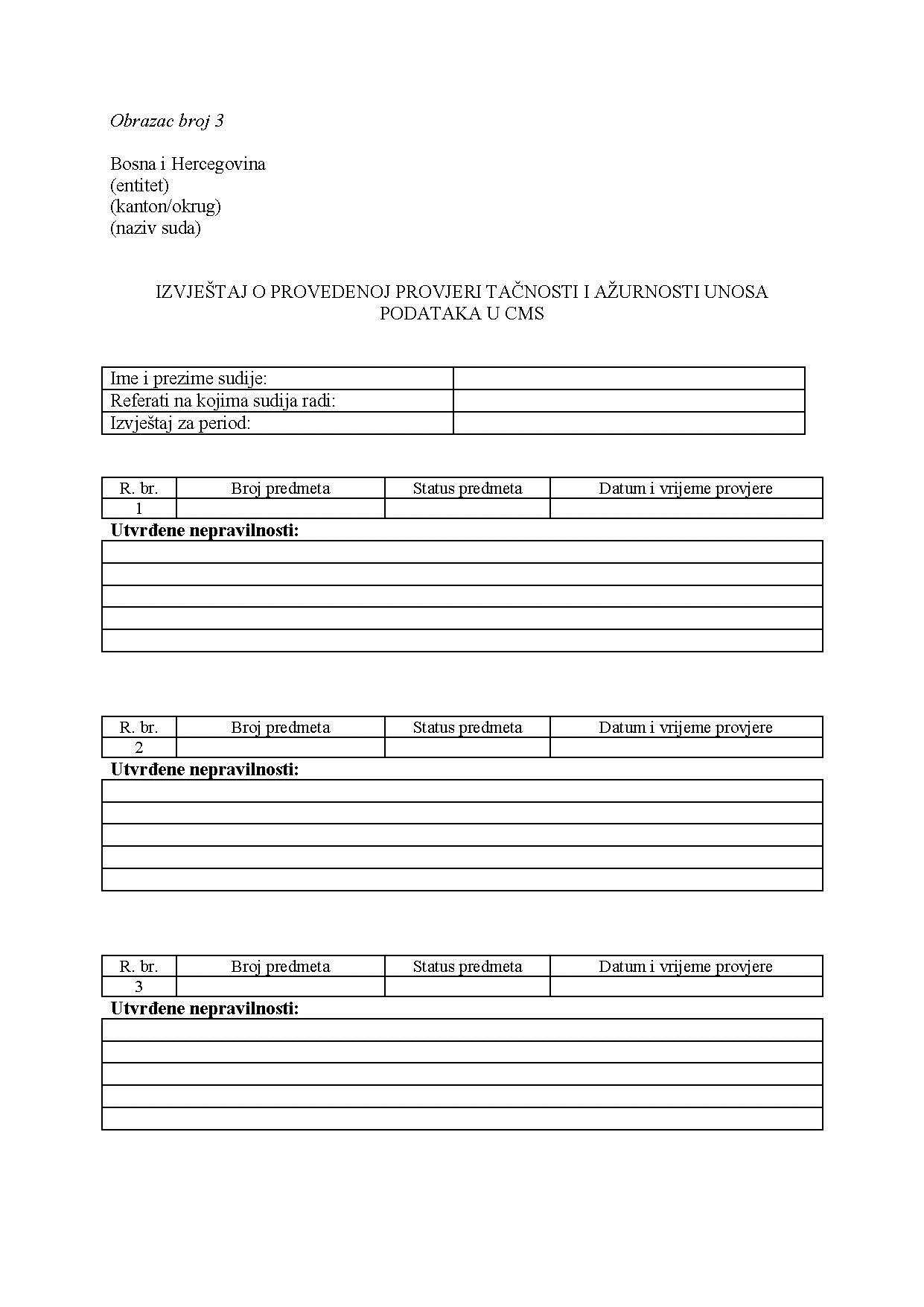 (1) Predsjednik suda, ili lice koje on ovlasti, za svakog sudiju čiji je rad predmet provjere, dužan je tačno i potpuno utvrditi rezultate provjere i popuniti izvještaj o provedenoj provjeri tačnosti i ažurnosti unosa podataka u CMS, propisan na obrascu broj 3 koji se ulaže u lični spis svakog sudije.